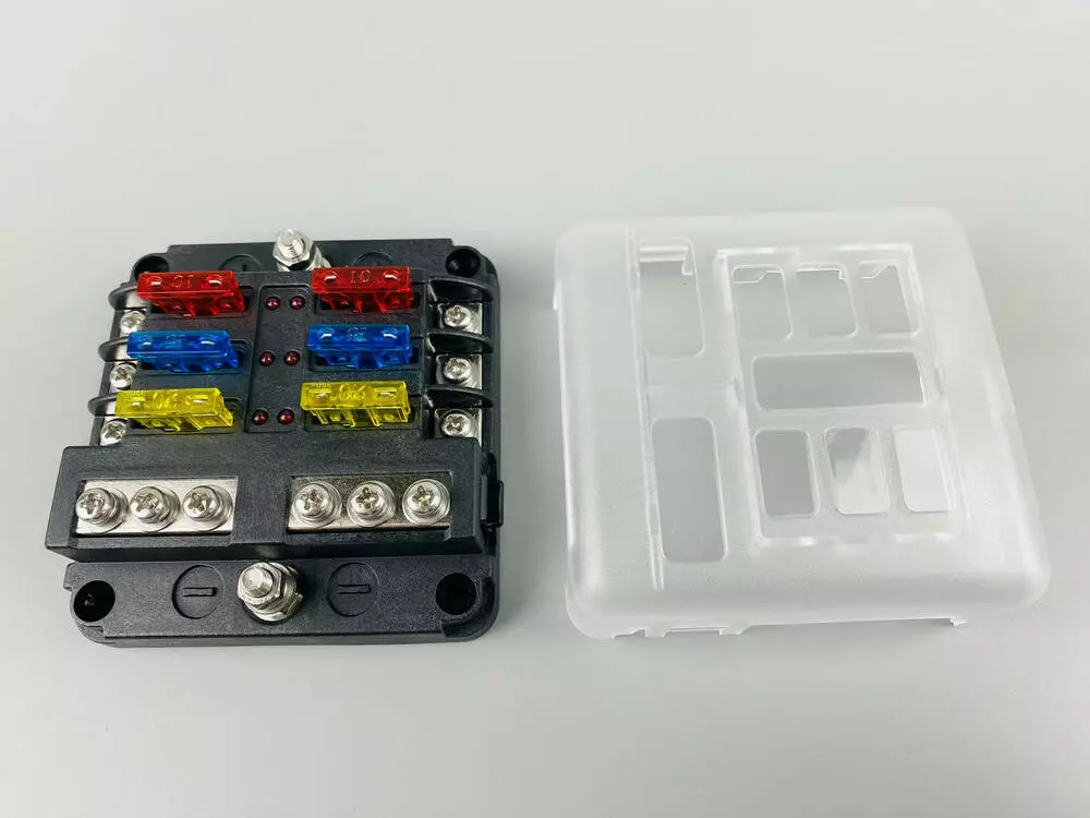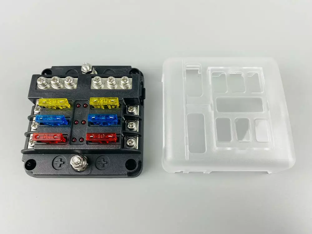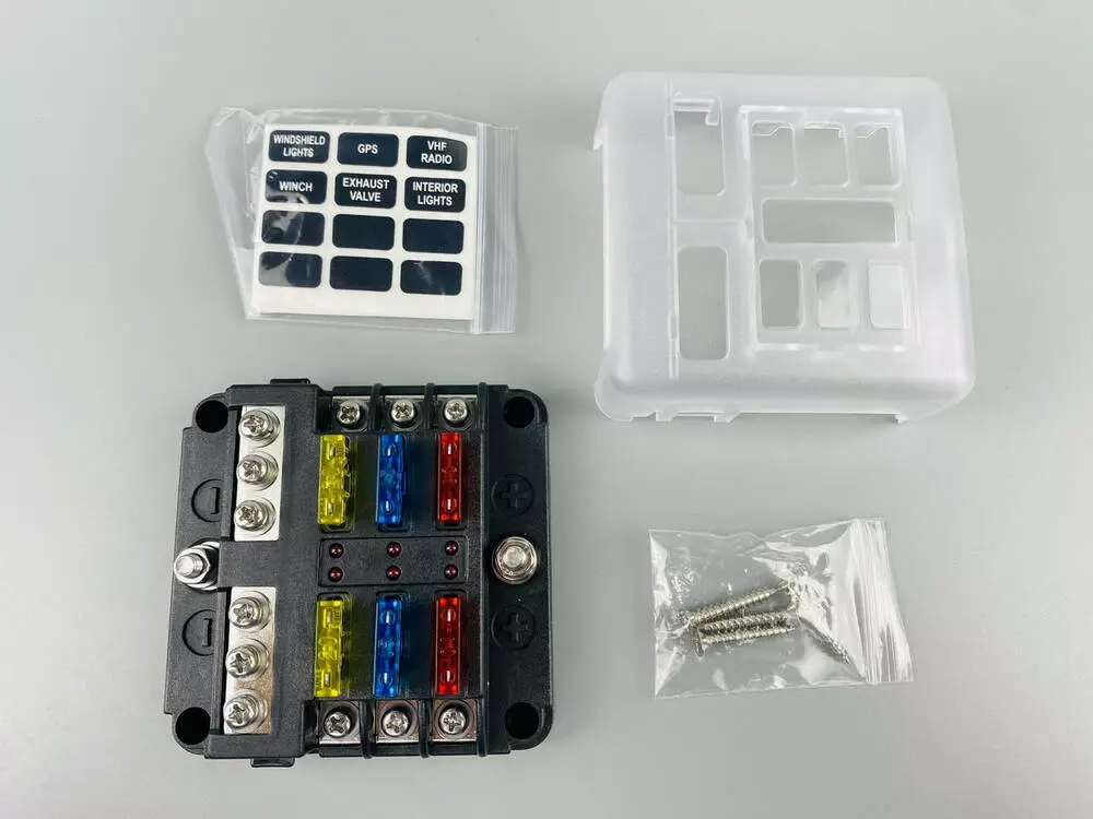 Размер: 88 х 88 х 37 мм. 12 предохранителей в комплекте + наклейки с обозначениями + 4 болта из нержавеющей стали