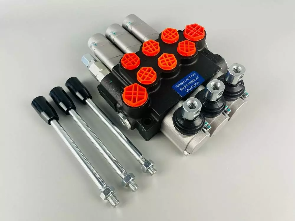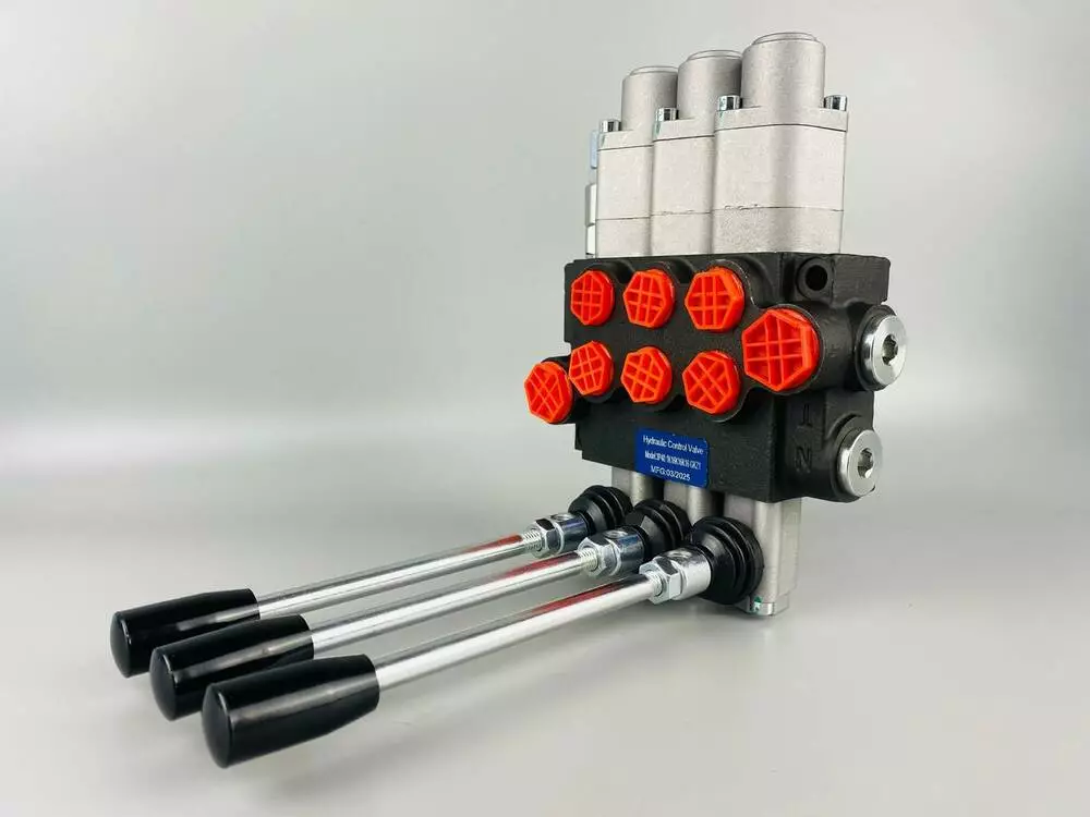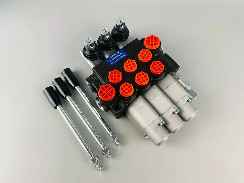 Количество секций и рычагов: Три секции и три рычага. Это означает, что распределитель может одновременно управлять тремя разными гидравлическими потребителями (например, тремя гидроцилиндрами) с помощью отдельных рычагов.