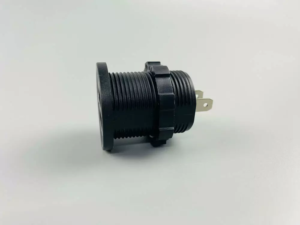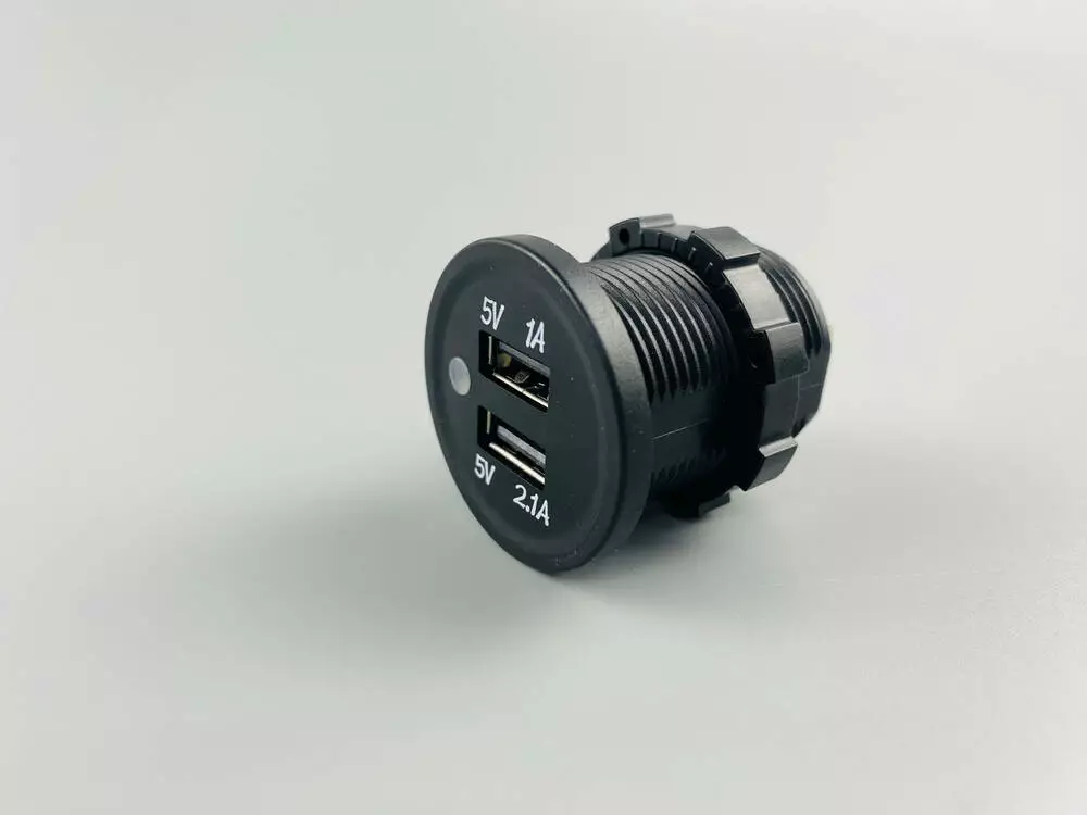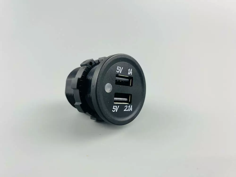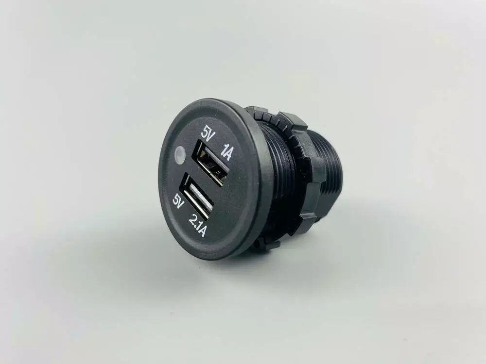 USB зарядное устройствоГнездо зарядное универсальное (вход 12V/24V) два выхода USB 5V/1A; 5V/2.1A размер 37мм(диаметр) х 40мм (длина) подсветка голубая, резиновый колпачок